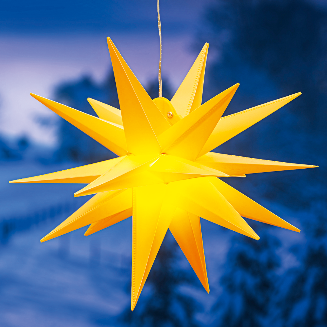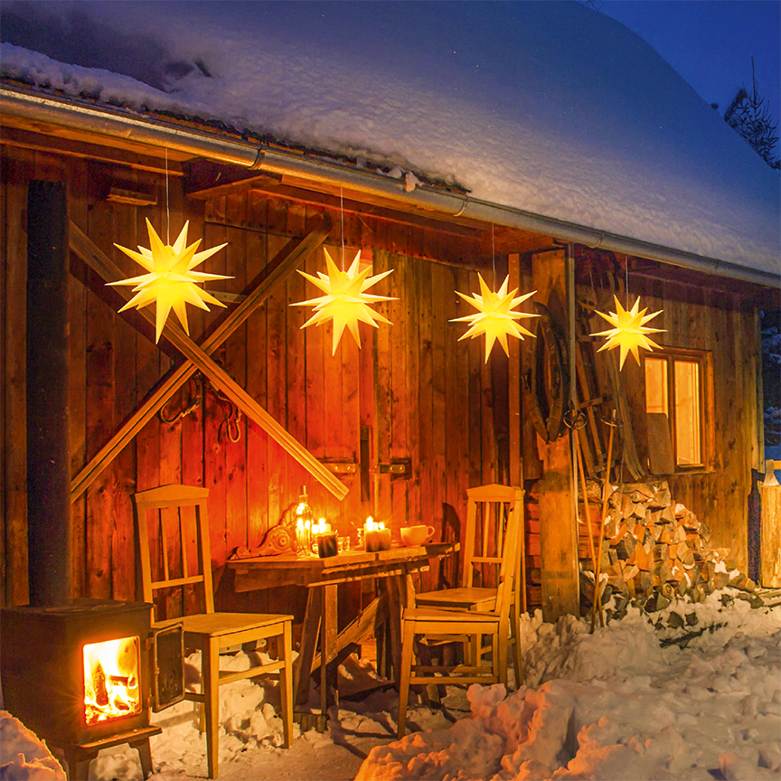 Als komfortables Extra besitzen die LED-Weihnachtsterne einen 6/18-Stunden-Timer und schalten sich täglich zur selben Zeit ein und wieder aus. Außerdem hat jeder Stern ein 1-m-Band mit Aufhängehaken, ist platzsparend zusammenfaltbar, kabellos und sogar die Batterien (2 x AA pro Stern) sind bereits im Liefer­umfang enthalten. Verwendbar im Innen- und im geschützten Außenbereich (IP44).