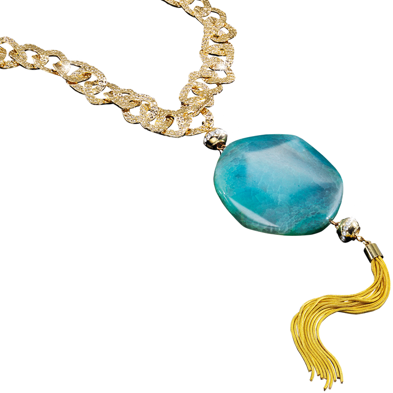 Doch nicht nur der mächtige Achat-Anhänger zieht alle Blicke auf sich, auch die extravagante Kette – mit großen, in sich verschlungenen Gliedern – ist ein echter Blickfang. Der Achat hat eine beachtliche Größe von ca. Ø 5 cm, die Kette (ca. 45 cm lang mit 7 cm Verlängerung) ist farbvergoldet. Eine spezielle Bearbeitung verleiht ihr einen ganz besonderen Glanz, der noch durch funkelnde Glassteine am Anhänger verstärkt wird. Den Abschluss dieses edlen Schmuckstücks bildet eine farbvergoldete Kordel.