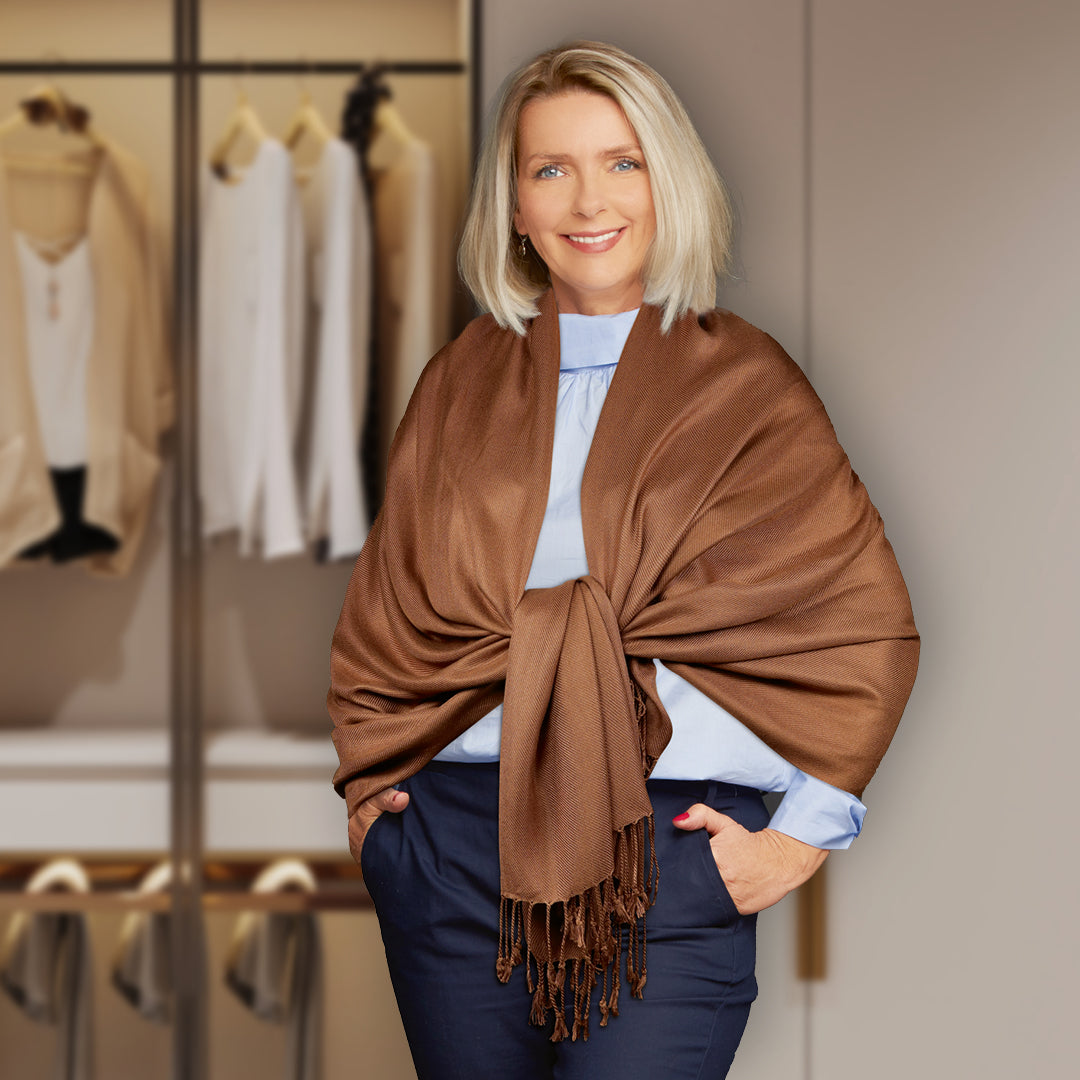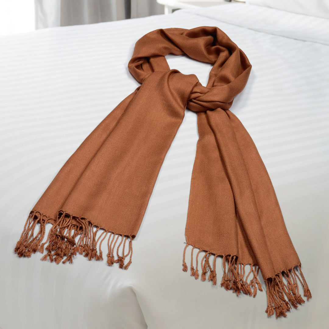Der Damenschal mit seiner erdigen Farbe lässt sich zu den verschiedensten Anlässen tragen. Nehmen Sie den Schal als Begleiter mit: