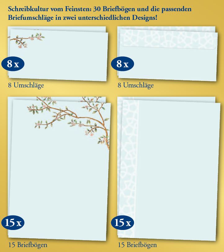 Mit dabei: Die ideale Ergänzung zu dem Buch bietet dieses exklusive Briefpapier-Set. Gerade heute, wo viele Menschen nur noch »elektronisch« kommunizieren, ist ein handgeschriebener Brief ein besonderes Zeichen der Wertschätzung. In der zauberhaft anmutenden und mit Goldprägung veredelten Mappe finden Sie 30 stilvoll gestaltete DIN A4-Briefbogen in zwei schönen Designs – und dazu passend 16 Briefumschläge.