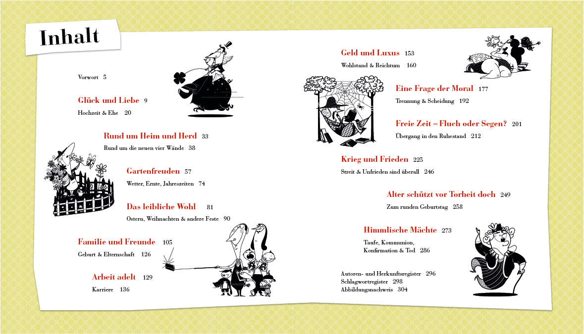 In zwölf Kapiteln widmet sich die Sammlung zentralen Themen des Lebens wie Glück und Liebe, Garten, Arbeit, Wohlstand und Luxus, Moral oder himmlischen Mächten. So lassen sich die Sprüche leicht entdecken und passend zu jedem Anlass nutzen. Ob für Karten, Reden, als Anregung für besondere Momente oder einfach zum Genießen beim Blättern – dieses Werk bietet für jede Situation die richtigen Worte.