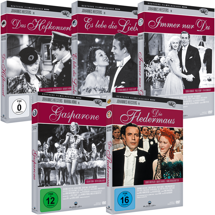 Unvergessen bleibt sein Evergreen aus »Die Fledermaus«: »Glücklich ist, wer vergisst, was nicht mehr zu ändern ist …«. Ob an der Seite von Fita Benkhoff, Willy Fritsch, Lizzi Waldmüller oder Marika Rökk – Johannes Heesters begeisterte in zahlreichen Operetten- und Revuefilmen. Dieses DVD-Set bringt fünf seiner schönsten Filmklassiker in Ihr Wohnzimmer: »Die Fledermaus«, »Gasparone«, »Immer nur Du«, »Es lebe die Liebe« und »Das Hofkonzert«.
