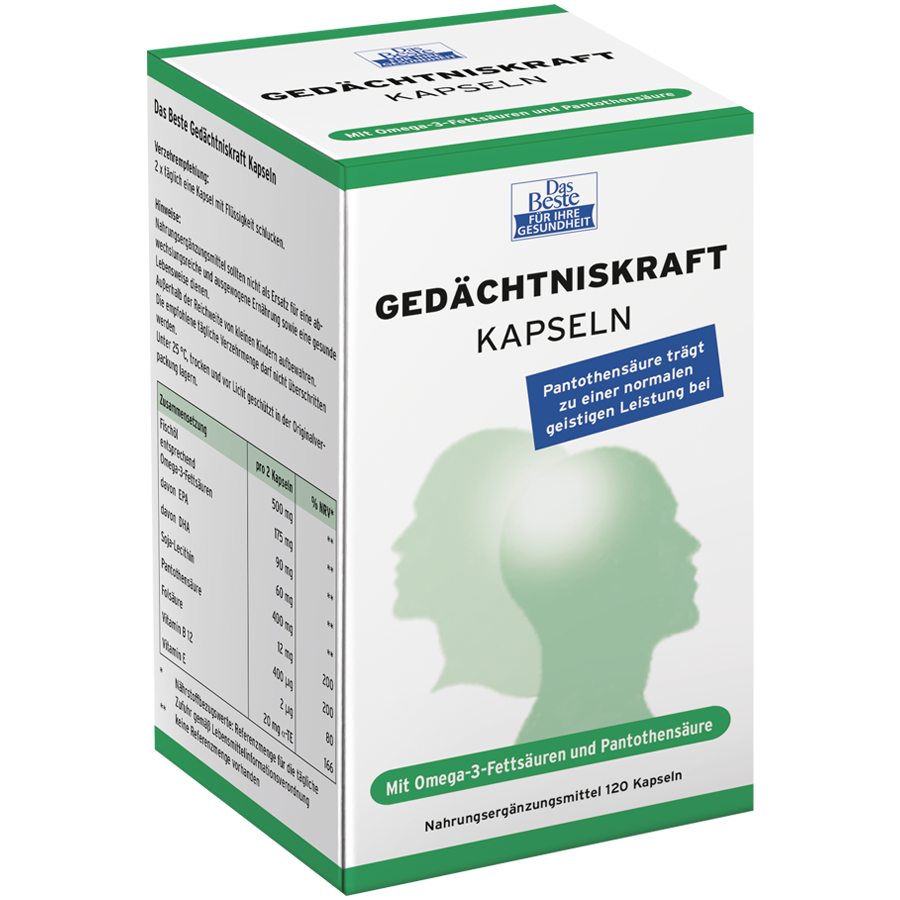 Für geistige Fitness im Alltag ist eine ausgewogene Nährstoffversorgung entscheidend. Die Gedächtniskraft Kapseln enthalten eine gezielte Kombination aus Omega-3-Fettsäuren, Soja-Lecithin und wertvollen Vitaminen – speziell abgestimmt zur Unterstützung normaler geistiger Leistung und psychischer Funktion. Ideal für alle, die ihre mentale Leistungsfähigkeit bewusst unterstützen möchten.