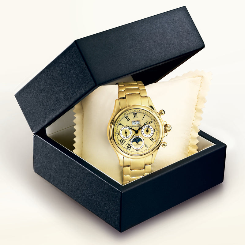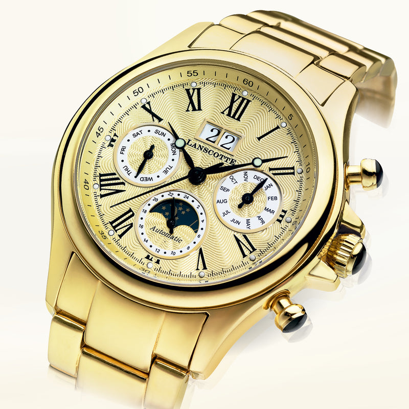 Mit der Lanscotte »Astronomy« präsentiert sich eine Automatikuhr für Herren, die Eleganz und Präzision auf höchstem Niveau vereint. Aus vergoldetem Edelstahl 316L gefertigt und mit Ionenplattierung aus 750er Gold veredelt, bietet dieses Modell dauerhaften Glanz und exklusive Haptik. Das große Zifferblatt mit drei Hilfsanzeigen und einem robusten, gewölbten Mineralglas spiegelt das Streben nach stilvoller Funktionalität wider.