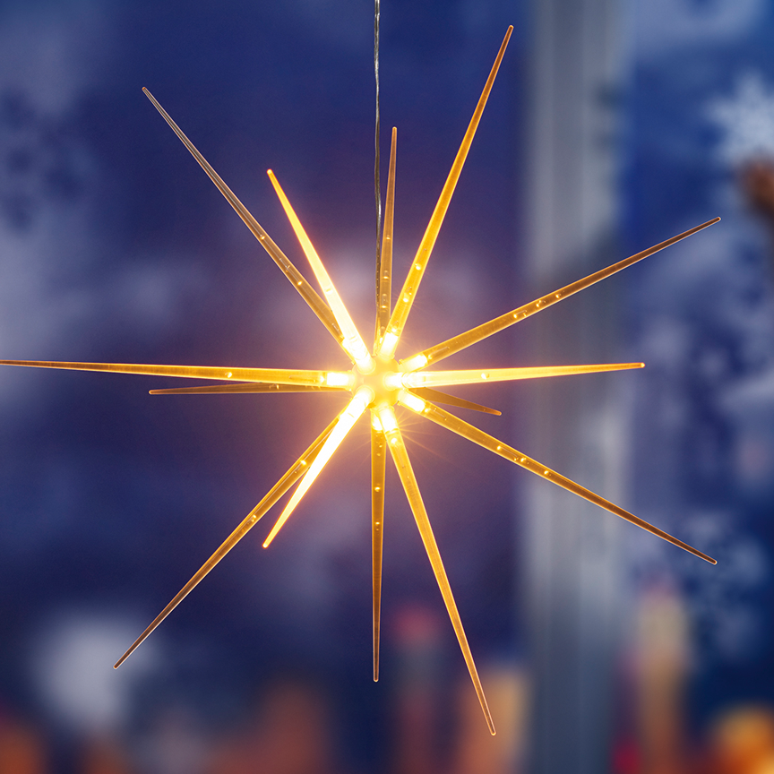 Die geschmackvolle Sternleuchte erstrahlt mit 14 LED-Lichtern und verbreitet so eine wunderschöne, unvergesslich festliche Atmosphäre. Das Licht leuchtet in beliebtem warmweiß, das bedeutet, dass zusätzlich eine angenehm warme Stimmung verbreitet wird. Die Kabelzuleitung beträgt ausreichende zwei Meter, alles ist ganz einfach zu montieren und acht verschiedene Leuchtfunktionen sind leicht einstellbar. Die vier AA-Batterien, die benötigt werden, sind bereits im Lieferumfang enthalten.