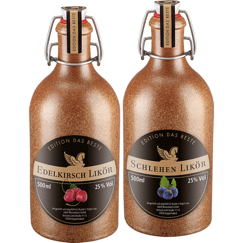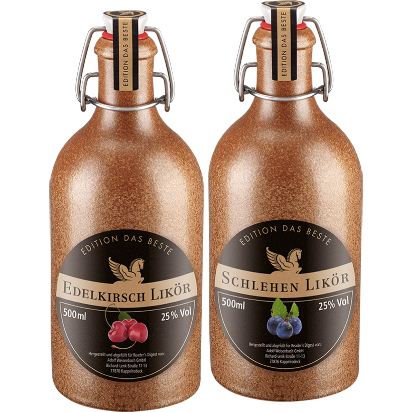 Freuen Sie sich auf zwei wohlschmeckende Liköre, die in der traditionsreichen Edelbrand-Manufaktur von Adolf Weisenbach in Kappelrodeck hergestellt werden: Edelkirsch und Schlehen Likör im Tonkrug. Für den Schlehen Likör verwendet er die kleinen, dunkelblauen Früchte des Schlehdorns, die dem rötlichen Likör eine fruchtig-würzige Note verleihen. Und der Edelkirsch Likör bekommt seine feine Note und das betörende Aroma von den saftigsten Kirschen an den Sonnenhängen des Schwarzwaldes. Sie erhalten die edlen Liköre in geschmackvollen Tonkrügen mit Bügelverschluss, in denen sie zu 100 % vor Licht geschützt sind.