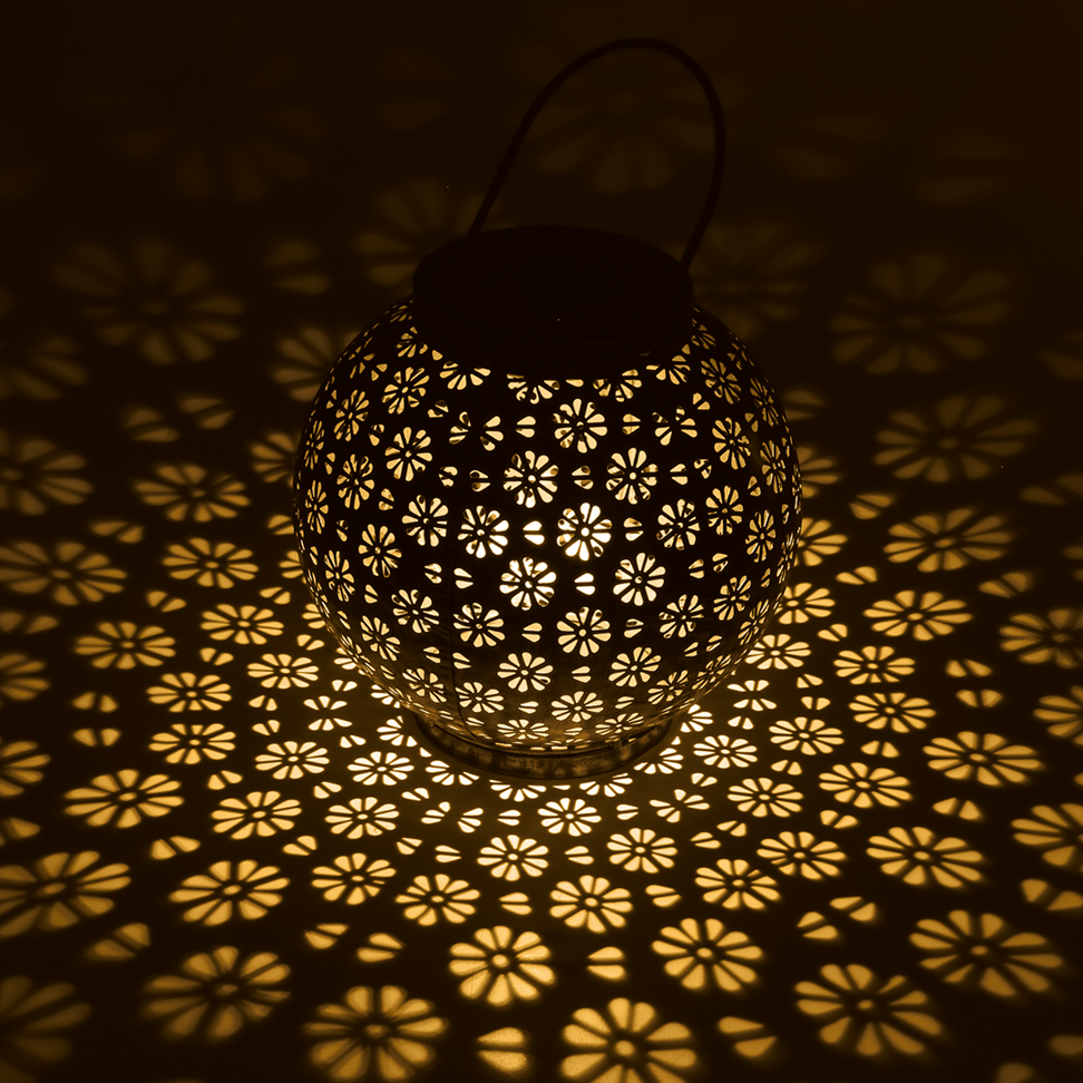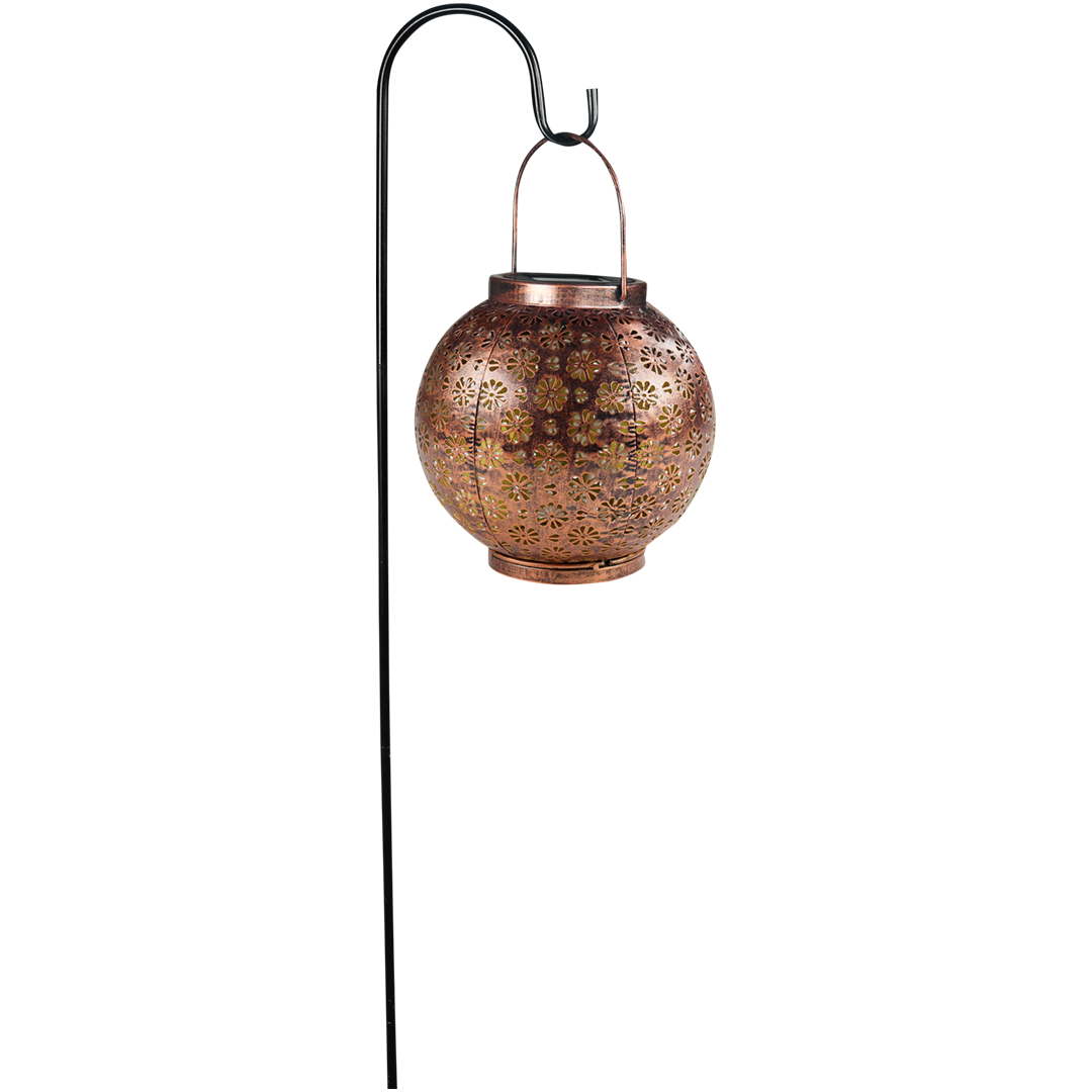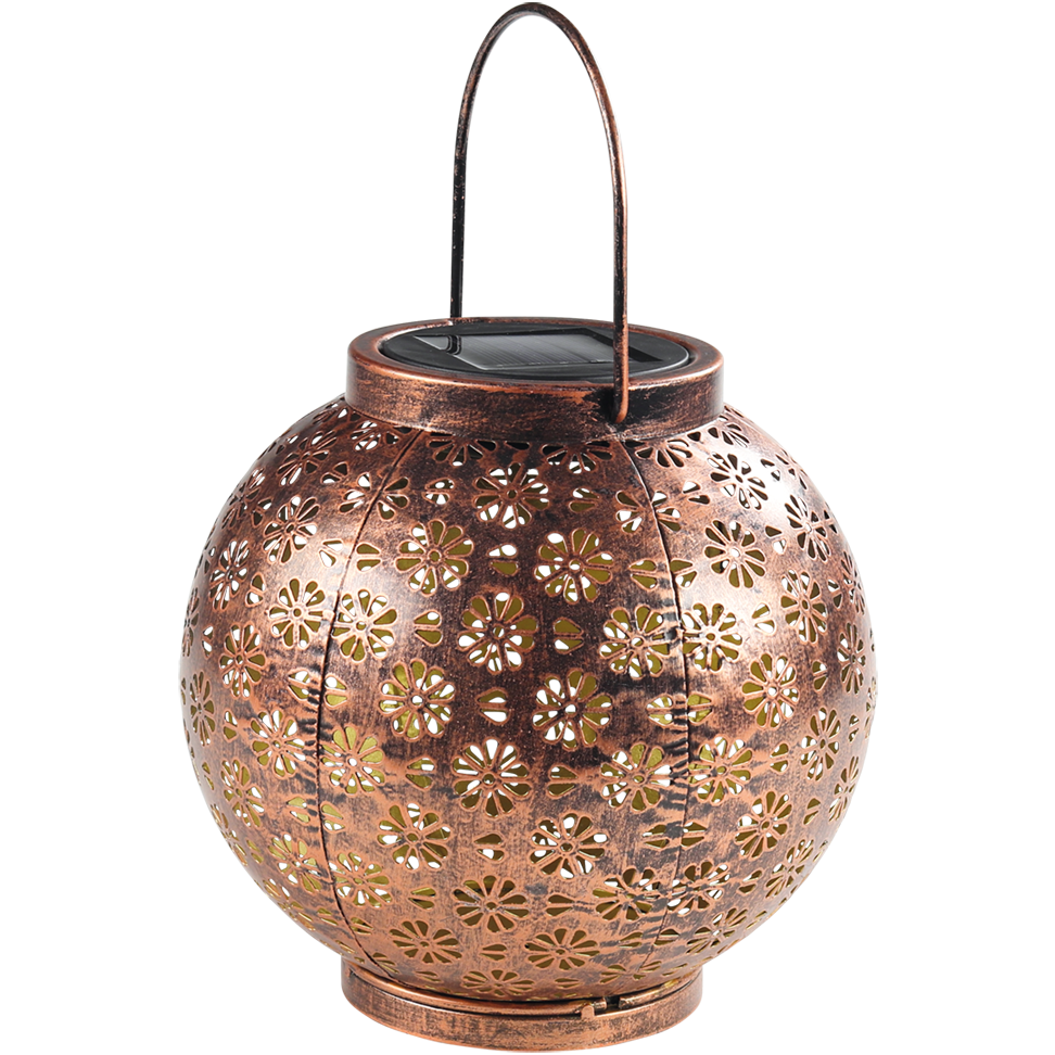 Einfach zauberhaft ist diese Solar-Laterne! Und geradezu magisch ist auch die Stimmung, die sie verbreitet, wenn sie ihr Licht abgibt. Einsetzbar ist die Leuchte idealerweise außen – zum Beispiel in Ihrem Garten oder auf Ihrer Terrasse. Der Korpus dieser Solarleuchte besteht aus Metall mit einer Schicht Kupfer, die das Ganze noch einmal viel edler erscheinen lässt. Durch zahlreiche Aussparungen in hübscher und zeitloser Ornamentik erzeugt sie – nach Aufladen durch Sonnenenergie – unzählige und besonders hübsche Lichtvarianten in ihrer Umgebung. Sie können diese wunderschöne Solar-Laterne einfach irgendwo an passender, Sonnenlicht-intensiver Stelle hinstellen oder – mit Hilfe des höhenverstellbaren Stabs – auch gerne aufhängen. Unvergessliche Momente sind bei Dunkelheit garantiert – und das alles ohne irgendwelche Kabel, Steckdosen oder Stromkosten! Einfach zauberhaft!