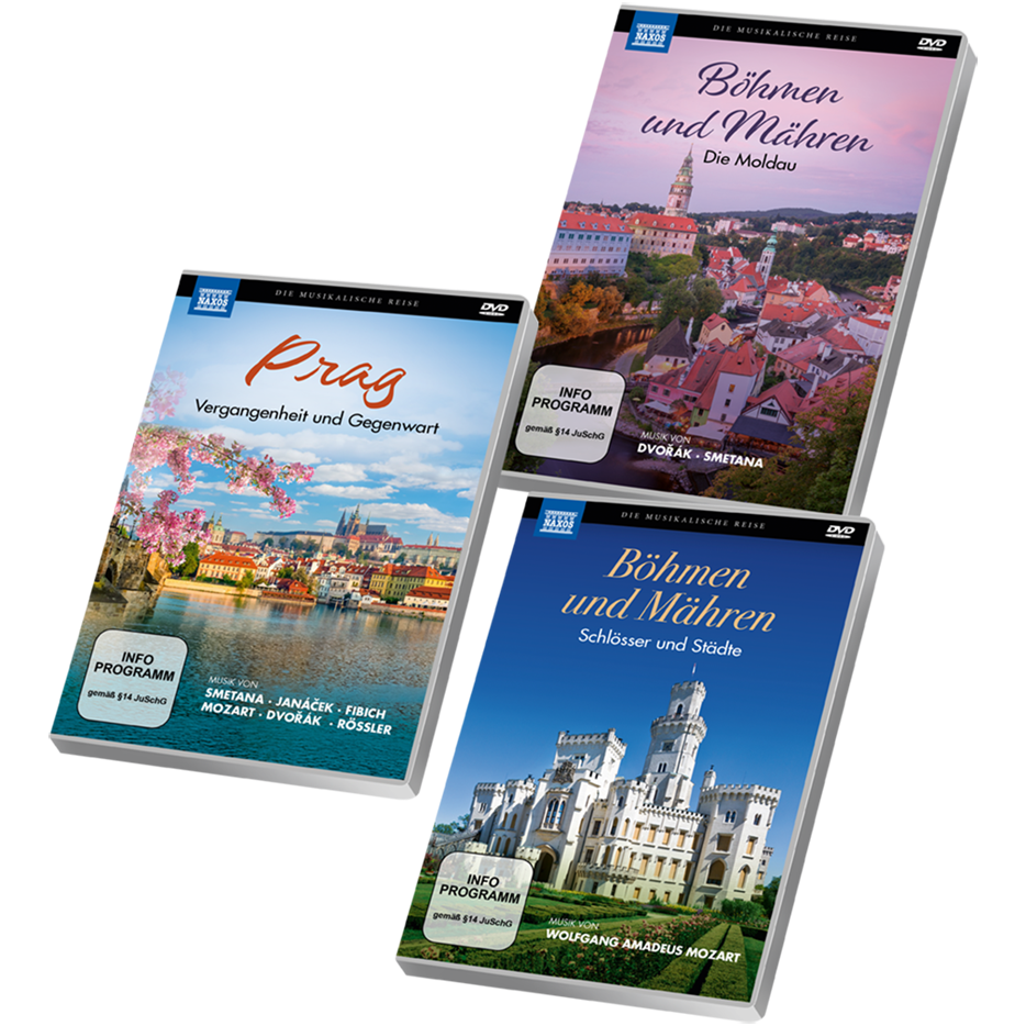 Diese musikalische Reise durch Böhmen und Mähren entführt Sie auf drei DVDs in die eindrucksvolle Welt mitteleuropäischer Kulturlandschaften und klassischer Meisterwerke. Genießen Sie rund drei Stunden faszinierende Filmaufnahmen – untermalt mit den schönsten Kompositionen von Janácek, Fibich, Dvorák, Rössler, Mozart und Smetana. Die harmonische Verbindung aus beeindruckender Architektur, romantischen Landschaften und feinster Musik macht dieses Erlebnis zu einer wahren Traumreise.