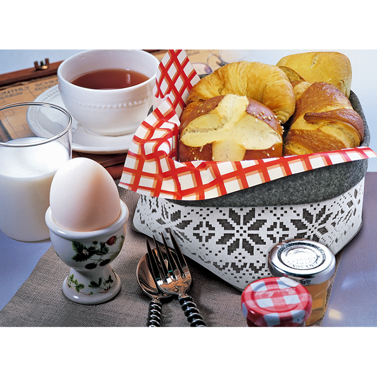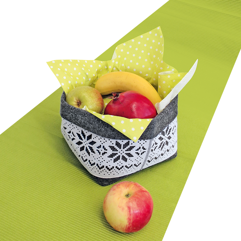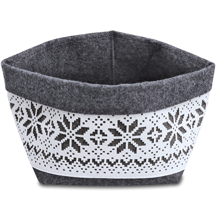 Starten Sie stilvoll in den Tag: Mit diesem charmanten Brotkörbchen aus dunkelgrauem Filz wird jedes Frühstück zu einem echten Hingucker. Der 2 mm starke Polyesterfilz sorgt für Stabilität, während die aufgesteppte weiße Filzborte im traditionellen Norwegermuster dem Körbchen eine besondere Note verleiht.