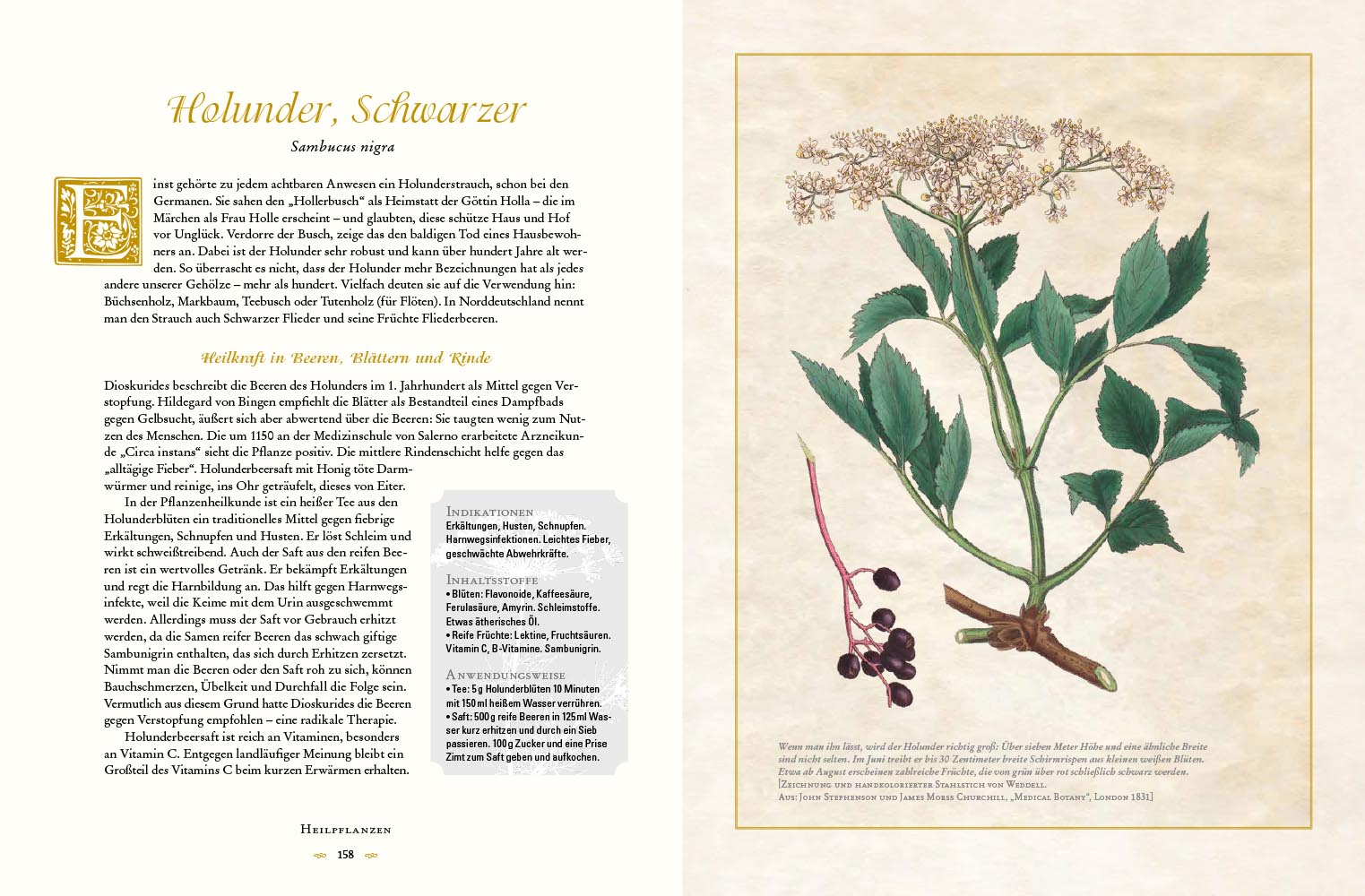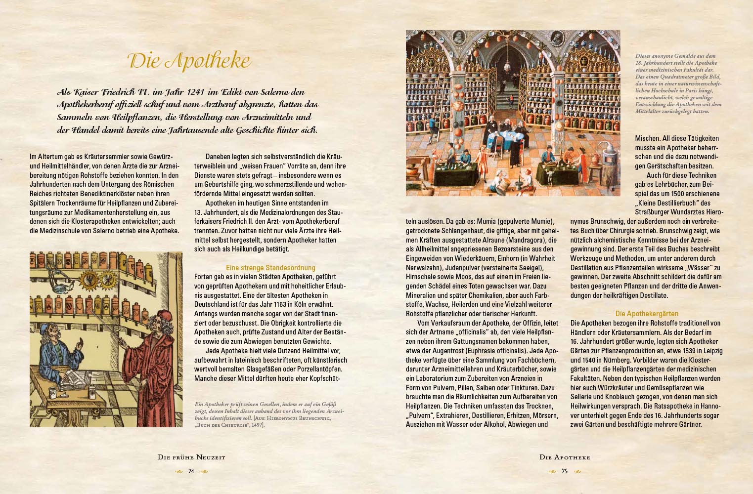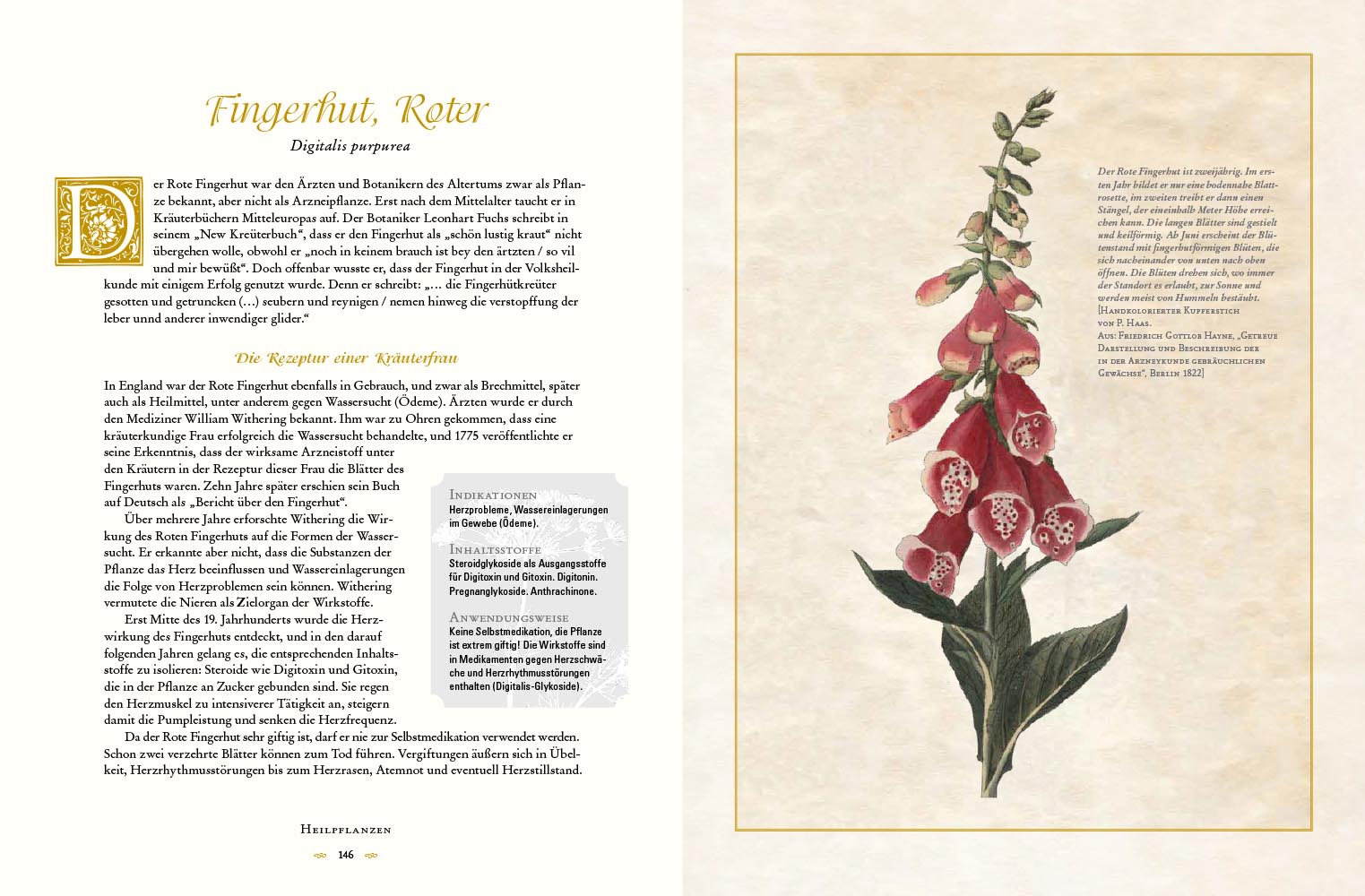 Alte Heilmethoden basieren auf den Schätzen der Natur. Im letzten Teil des Buchs begegnet Ihnen daher ein umfassender Pflanzenteil. Er stellt die wichtigsten Heilkräuter von A (wie Augentrost) bis Z (wie Zimtbaum) vor. Tauchen Sie tief in die Naturapotheke ein und informieren Sie sich über die vielfältigen Anwendungsmöglichkeiten von Heilpflanzen. Sie werden überrascht sein, welche Heilwirkung auch unscheinbaren Pflanzen wie Löwenzahn innewohnt. Die prachtvolle Ausstattung mit über 100 detaillierten Abbildungen aus alten Handschriften und Druckwerken macht Ihre Reise durch die Kräuterkunde zu einem Erlebnis für die Sinne. Lassen Sie sich von den alten Heilmethoden auf Pflanzenbasis begeistern!