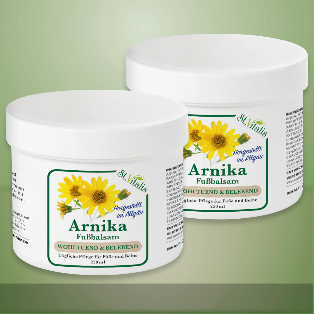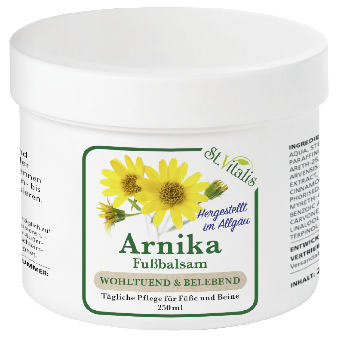 Gesunde Beine beginnen bei gepflegten Füßen: Der St. Vitalis Arnika Fußbalsam sorgt bei regelmäßiger Anwendung für spürbare Erleichterung – ideal bei Brennen, unangenehmem Fußgeruch oder Hornhautbildung. Die wohltuende Wirkung natürlicher Inhaltsstoffe, allen voran Arnika-Öl, pflegt intensiv, beruhigt und vitalisiert müde Füße.