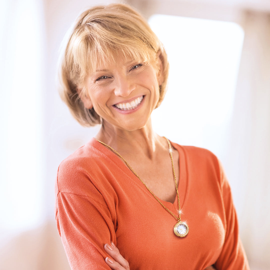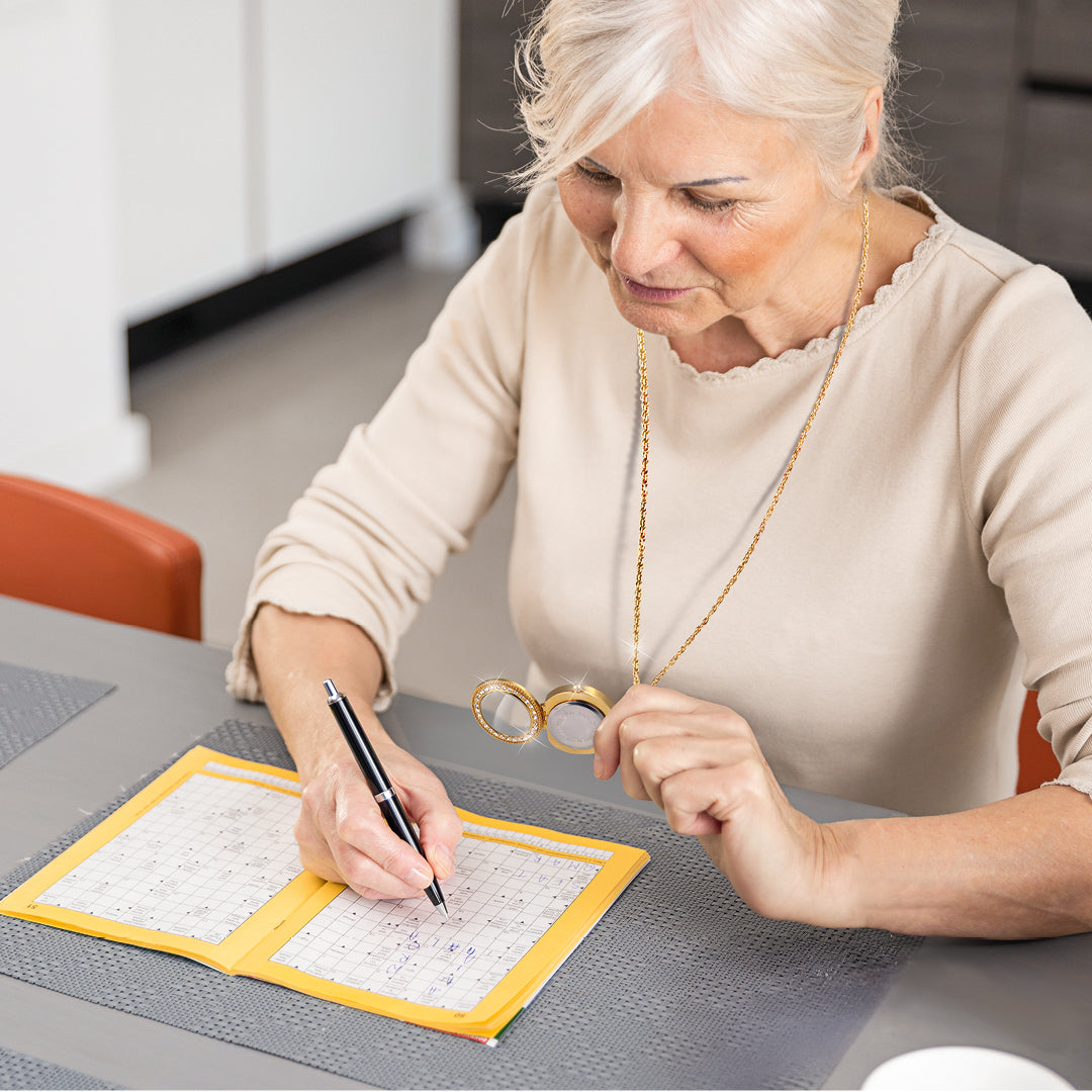 Dieses elegante Lupen-Collier mit Uhr vereint luxuriöses Design mit durchdachter Funktionalität. Als stilvolles Accessoire bietet es nicht nur einen edlen Look, sondern erleichtert durch seine integrierte 3-fache Vergrößerungslupe auch Ihren Alltag. Perfekt für alle, die kleine Schriften besser erkennen möchten – ob beim Lesen von Beipackzetteln, Etiketten oder beim Einkaufen.