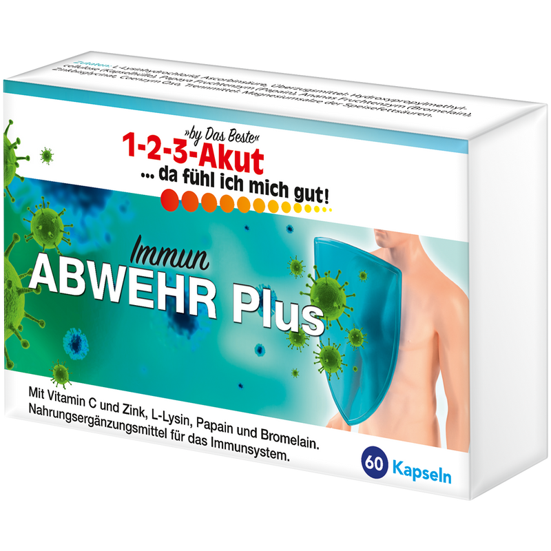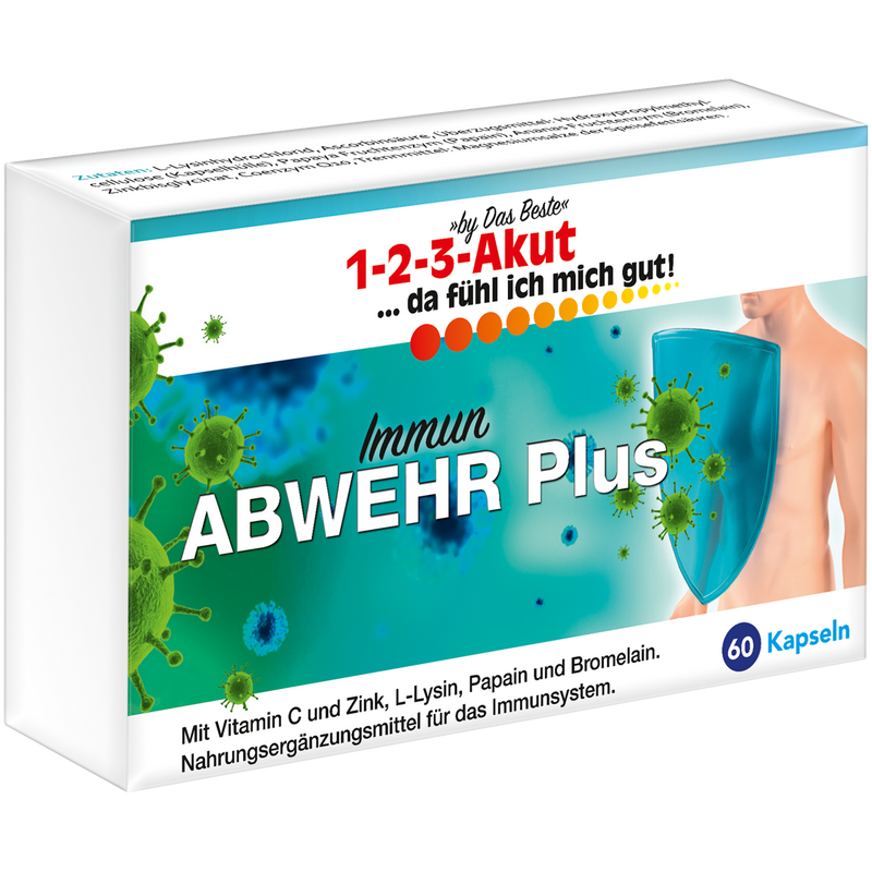Mit 1-2-3-Akut Immun-Abwehr Plus setzen Sie auf gezielte Immununterstützung mit wertvollen Mikronährstoffen. Gerade in der Erkältungszeit ist eine starke Immunabwehr essenziell – Vitamin C und Zink tragen zu einer normalen Funktion des Immunsystems bei und helfen, Zellen vor oxidativem Stress zu schützen. Die natürliche Enzymkraft aus Papain (Papaya) und Bromelain (Ananas) unterstützt zusätzlich den Stoffwechsel und fördert die Abwehr.