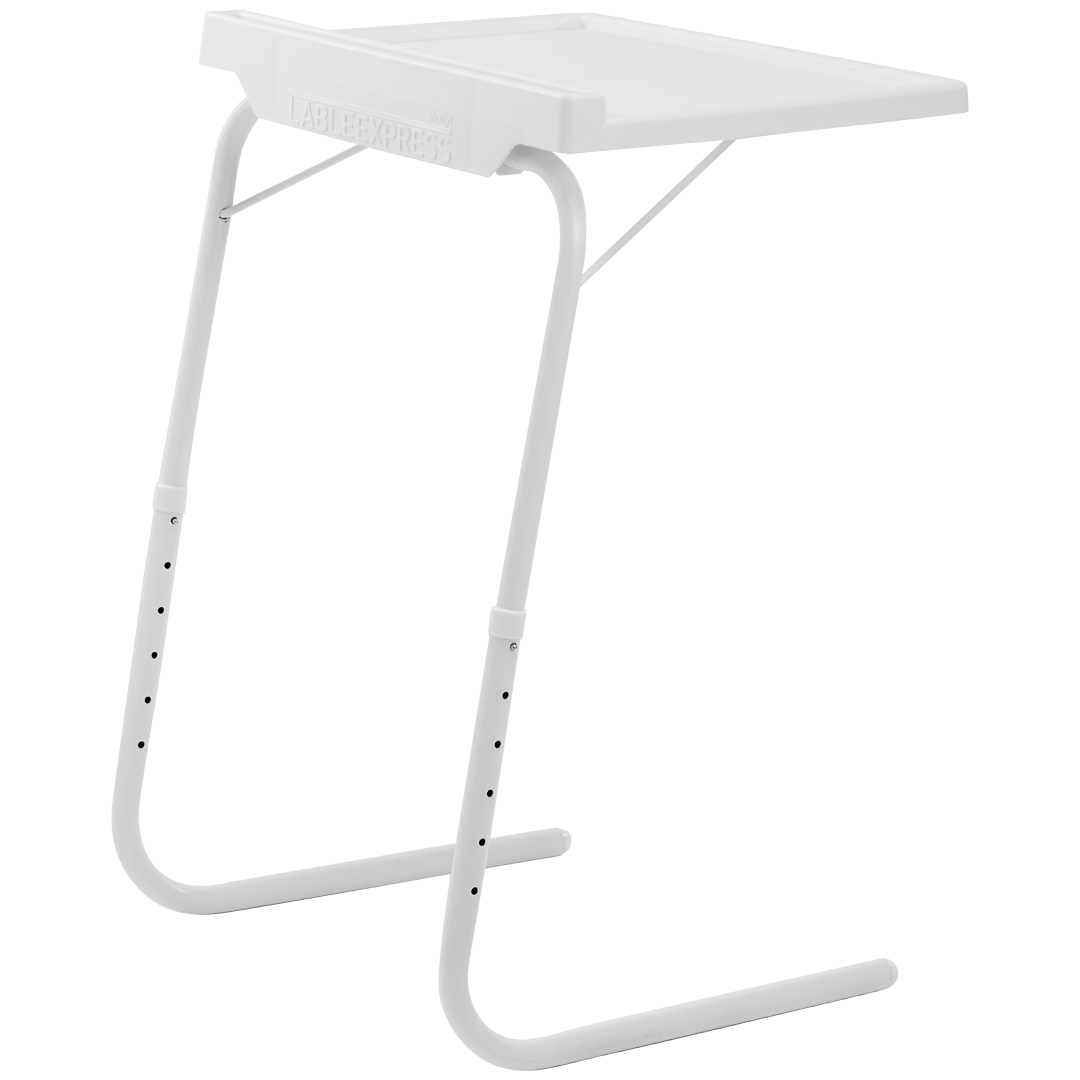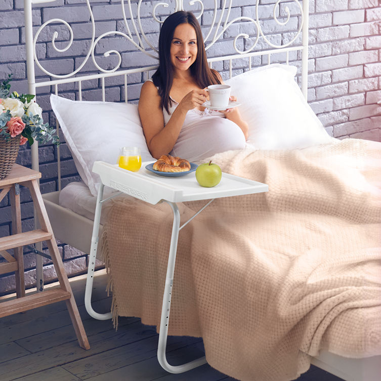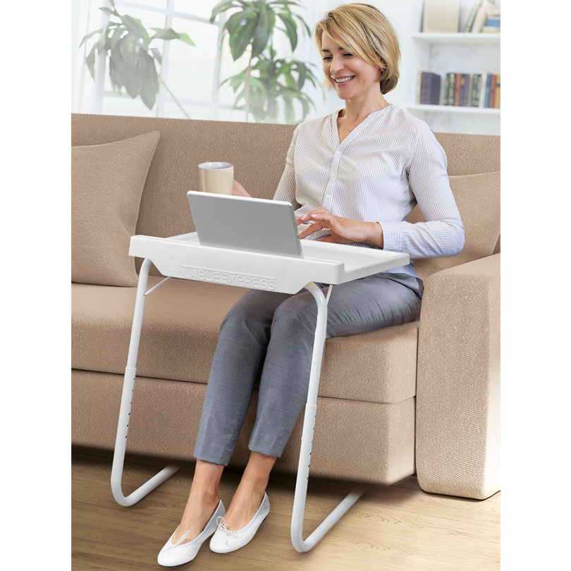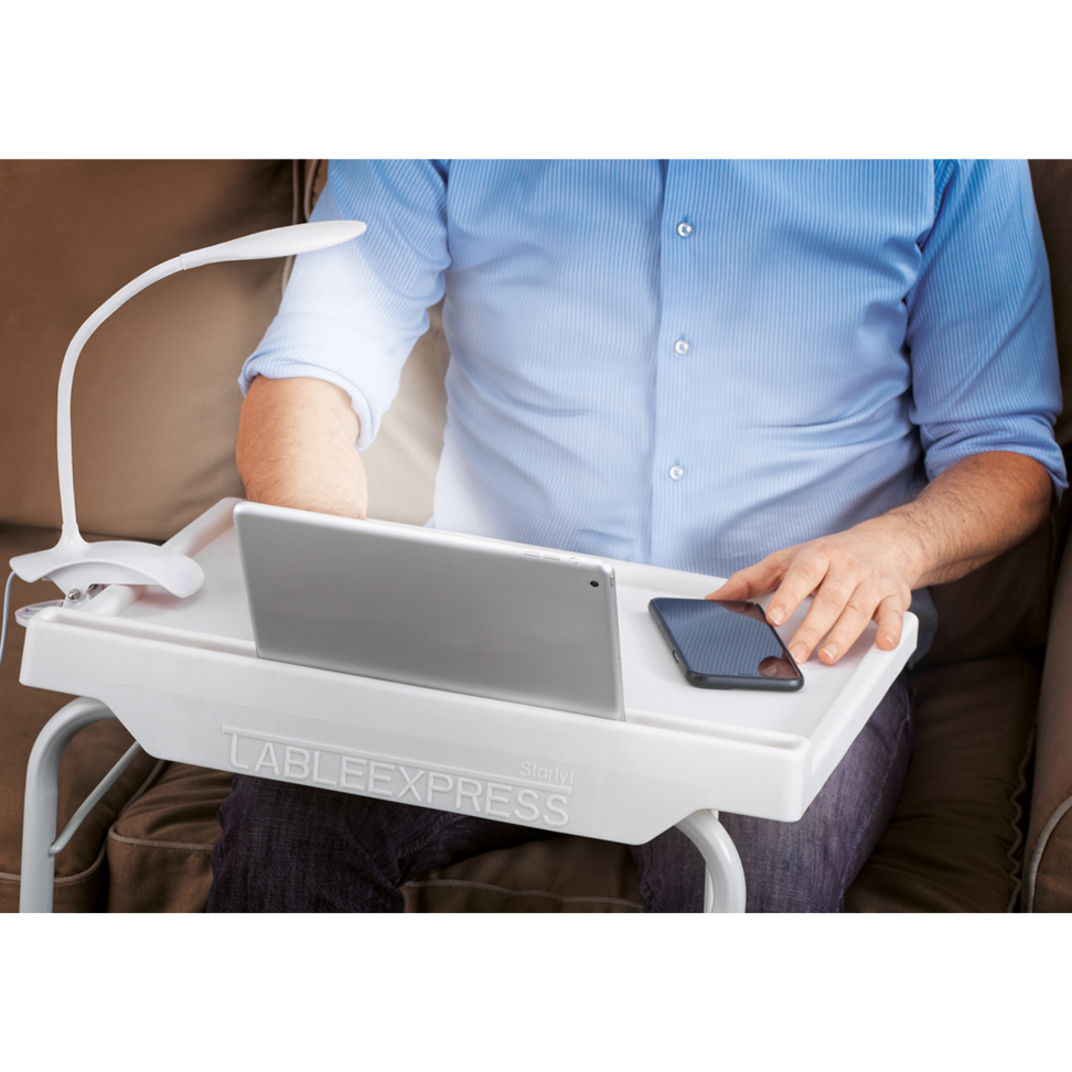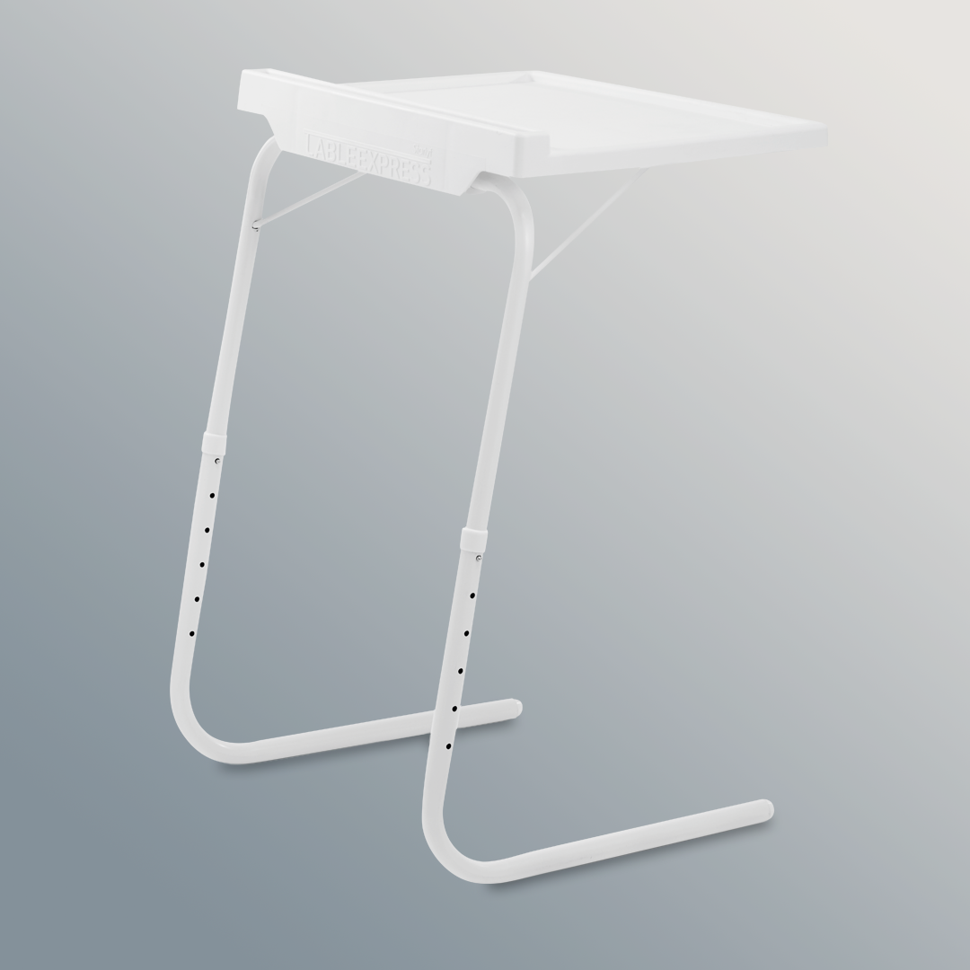 Die stabile Kunststoff-Tischplatte (52 × 40 cm) ist nicht nur großzügig bemessen, sondern auch mit einem integrierten Halter für Tablet oder Smartphone ausgestattet – perfekt für Videochats, Serienabende oder das digitale Arbeiten. Die in sechs Stufen höhenverstellbaren und in drei Winkeln neigbaren Metallstandfüße machen den Tisch individuell anpassbar – für Erwachsene wie auch Kinder.