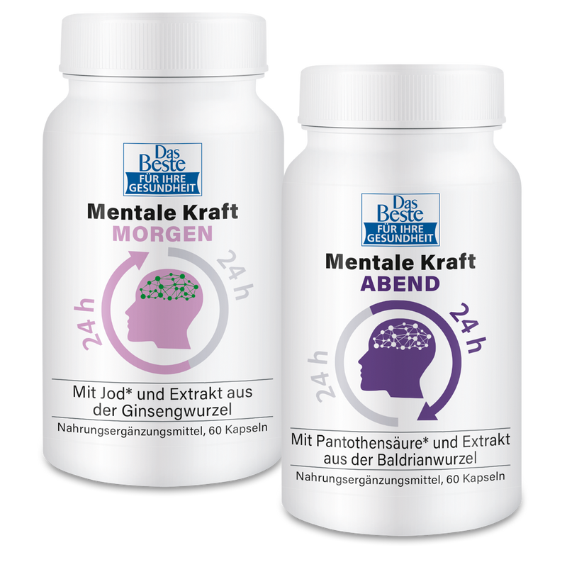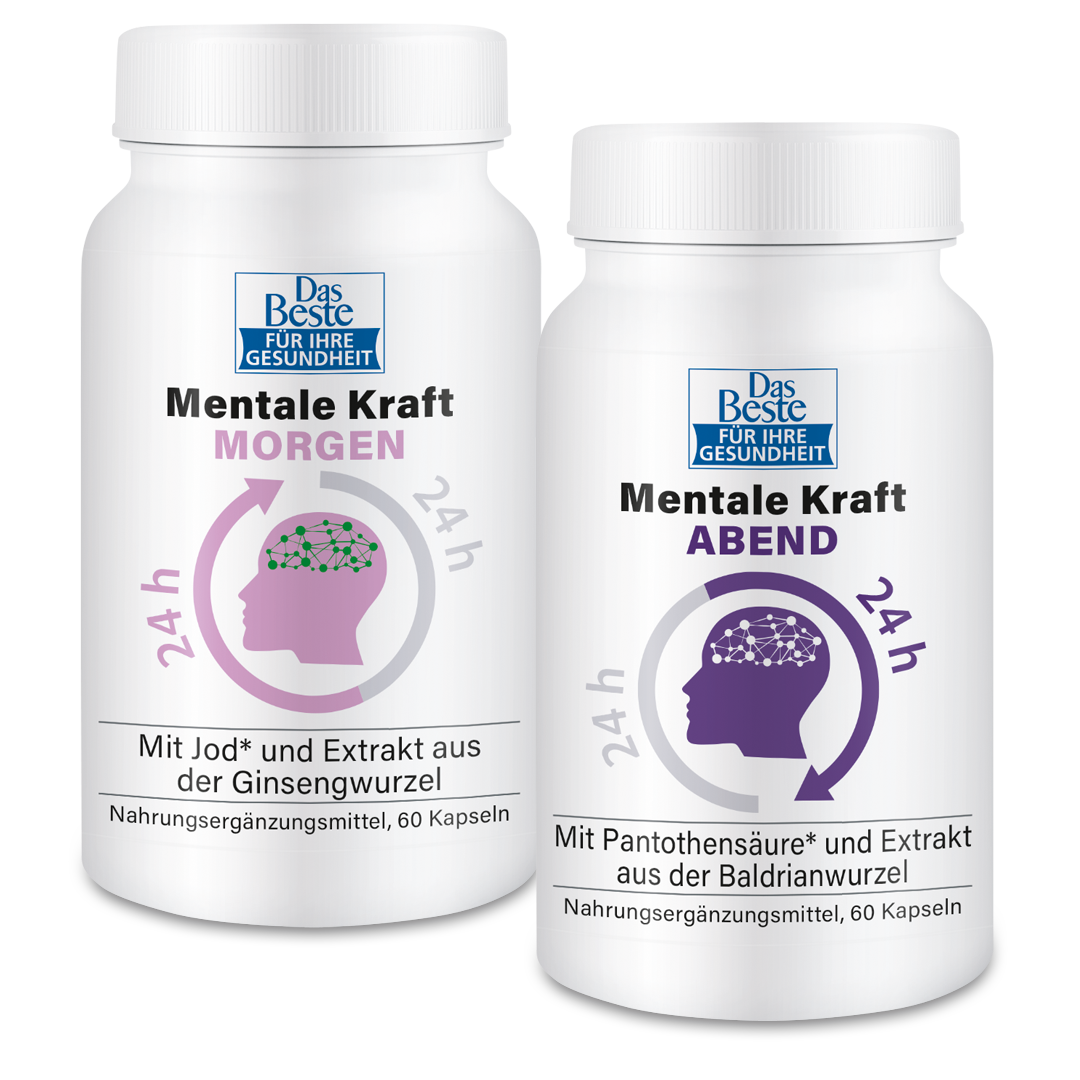 Das Nahrungsergänzungsmittel mit 2-Phasen-System »Mentale Kraft Morgen/Abend« kombiniert gezielt Mikronährstoffe und Pflanzenextrakte für den Tag und für die Nacht. Das Gehirn benötigt kontinuierlich Energie und spezifische Nährstoffe für seine normale Funktion. Die Rezepturen sind funktional getrennt: aktivierend am Morgen, ergänzend am Abend.